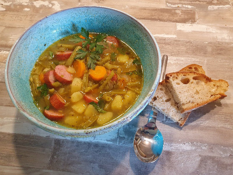 Klassischer Eintopf mit grünen Brechbohnen, Kartoffeln, Karotten, Sellerie und auf Wunsch Wurst (z.B. Mettenden oder Wiener,...) alternativ: vegetarisch auch sehr lecker!