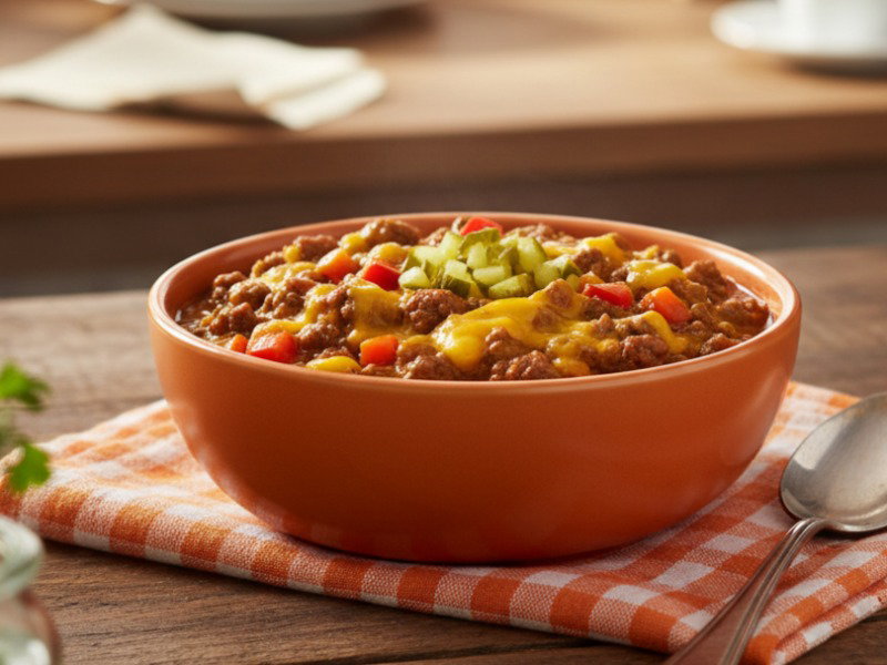 Eine sämige, käsige Suppe mit genau den Noten, die nach Cheeseburger schmecken: Hack, Cheddar, Ketchup, Senf, Gurken.