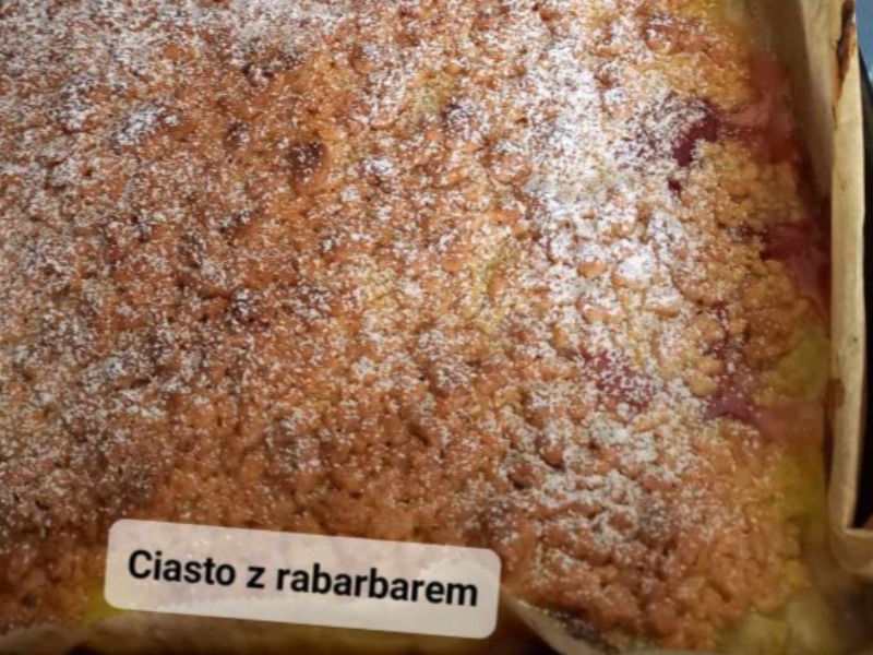 pyszne ciasto zalane gorącym budyniem. Można też zrobić zamiast rabarbaru jakieś kwaśne owoce np. śliwki