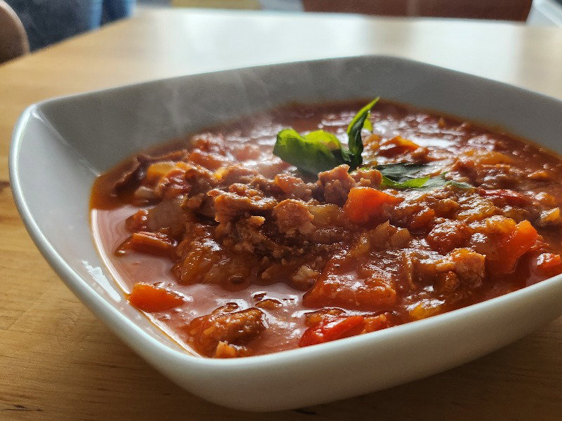 Leczo węgierskie z papryką, cebulą i kiełbasą. Zalecam użycie osłonki na noże po podsmażeniu kiełbasy aby składniki były całe.