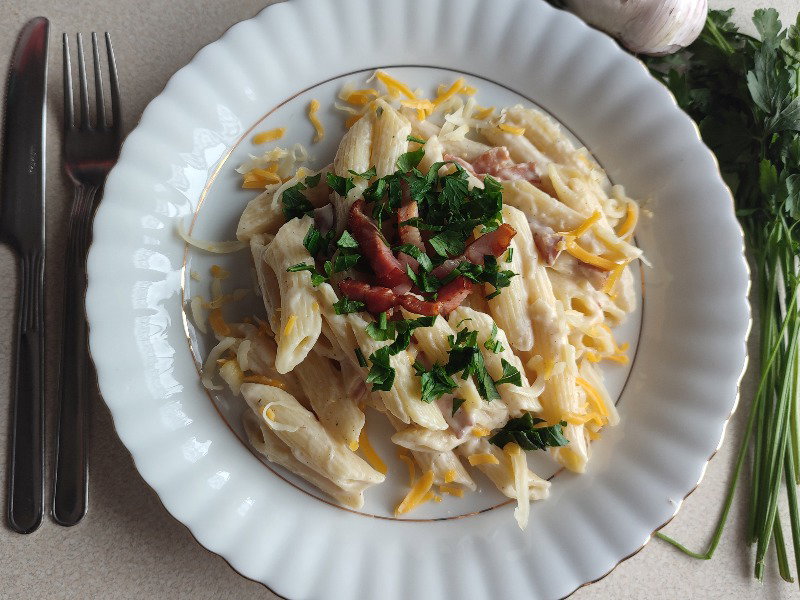 Pyszne, szybkie danie. U mnie wersja z makaronem penne, ale można użyć dowolnego, ulubionego makaronu.