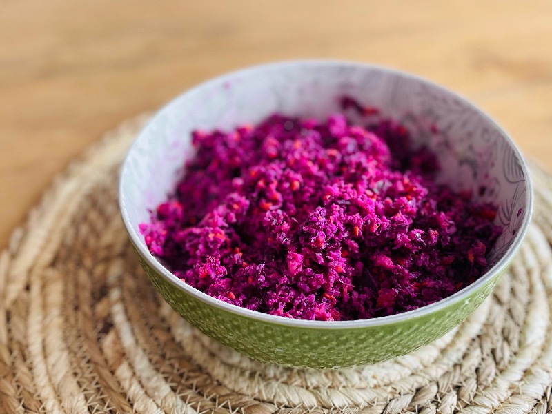 Surówka z czerwonej kapusty z dodatkiem marchwi i jabłka.
